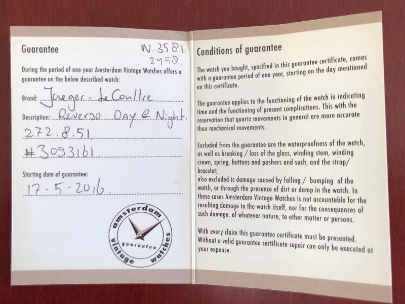 Die Uhr kommt mit Umkarton, Box, Gebrauchsanleitung, undatierter Garantiekarte mit dem Stempel eines Konzessionärs in Toulouse und die Garantiekarte des Händlers aus Amsterdam (s. Bilder) Marke: Jaeger-LeCoultre
