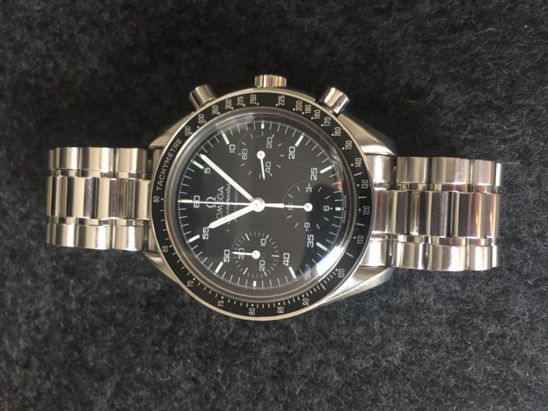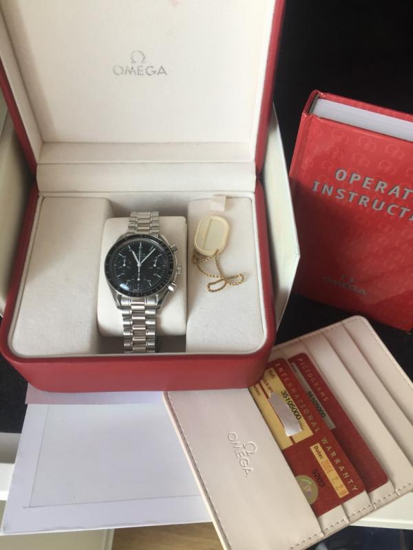 verkaufe aus meiner privaten Sammlung eine selten getragene Omega Speedmaster Automatic (39mm). Die Uhr hat einen kleinen Kratzer im Glas unten links (siehe Bild). Lässt sich aber einfach raus polieren (da Plexiglas). Band hat keinerlei Stretch. Box, Papiere (sogar Hangtag) sind vorhanden.