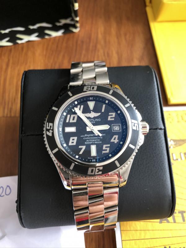 Ich biete aus meiner Sammlung eine Breitling Superocean A17364 mit schwarzem Zifferblatt und schwarzer Lünette an.