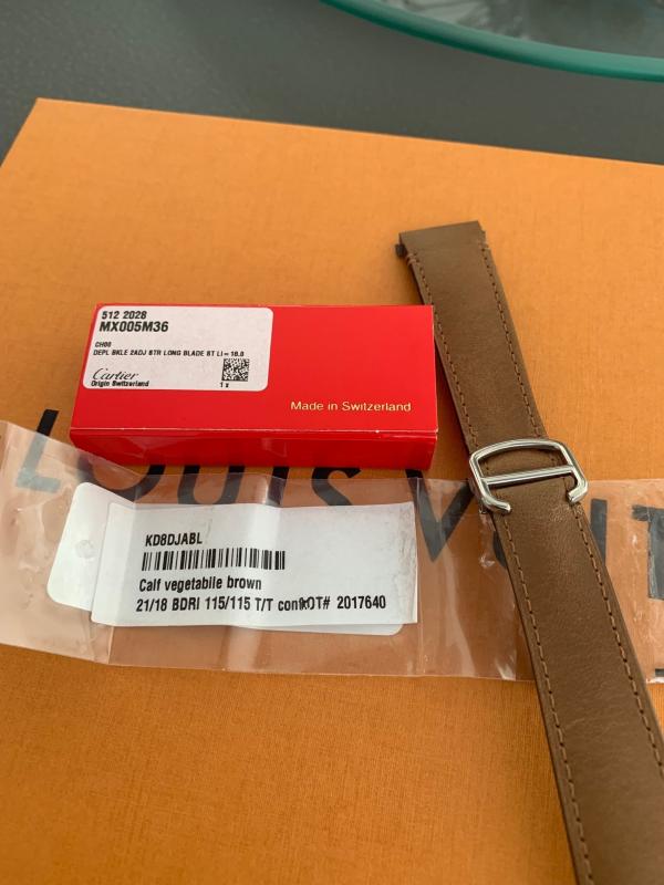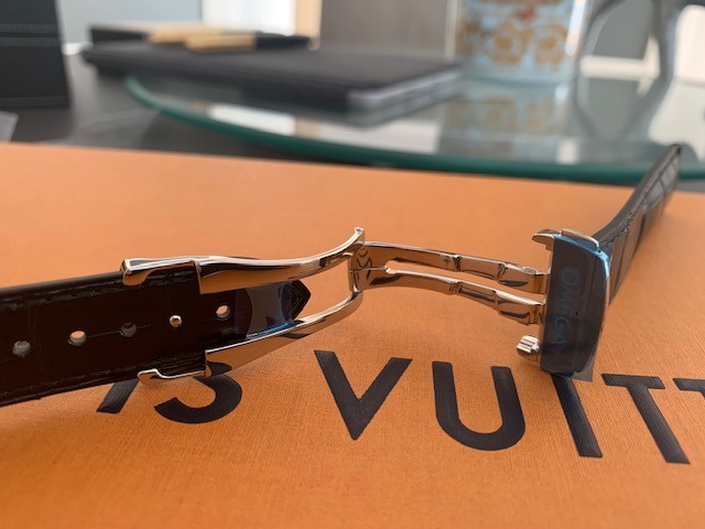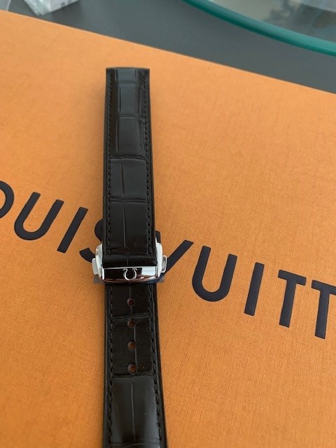 2. Lederband für Cartier Santos 39 mm mit Faltschließe und Schnellwechselsystem, ungetragen, 375 Euro. Es gab scheinbar im Herbst 2020 2 Varianten der Faltschließe und das sollte die im Herbst 2020 aktuelle Faltschließe sein.