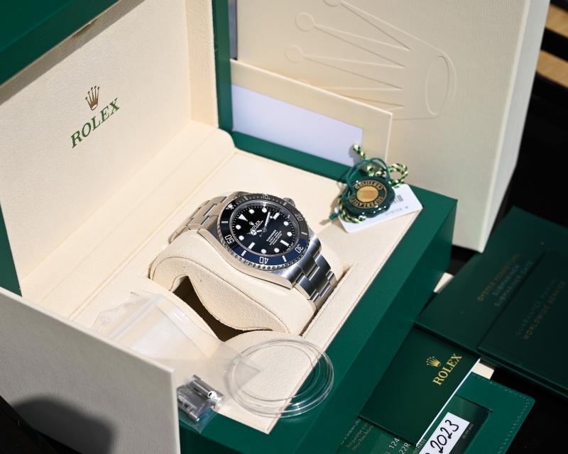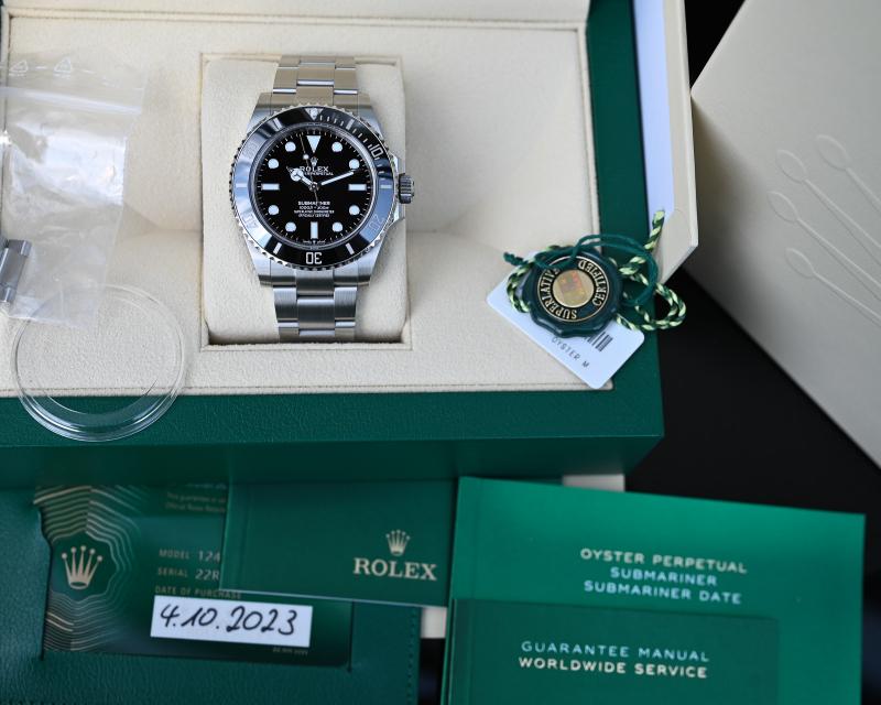 Angeboten wird eine Rolex Submariner 124060 mit Kaufdatum 10/2023 – somit besteht Herstellergarantie bis Oktober 2028.