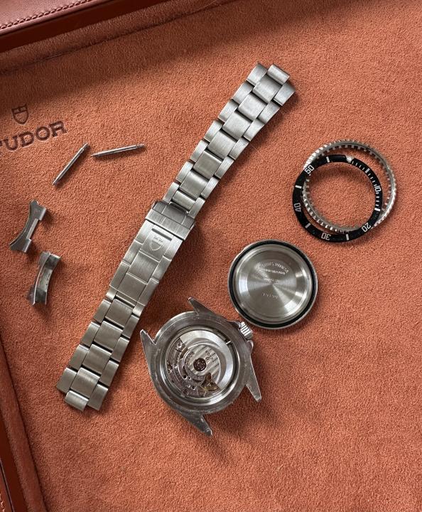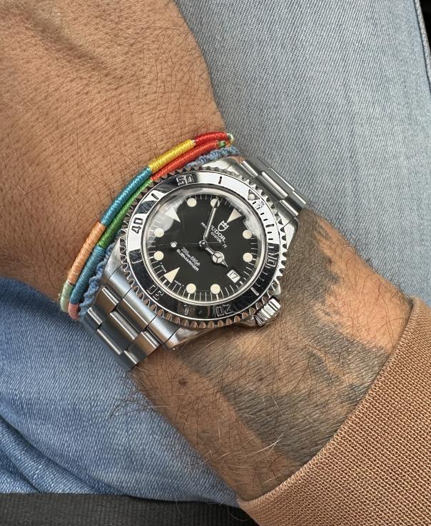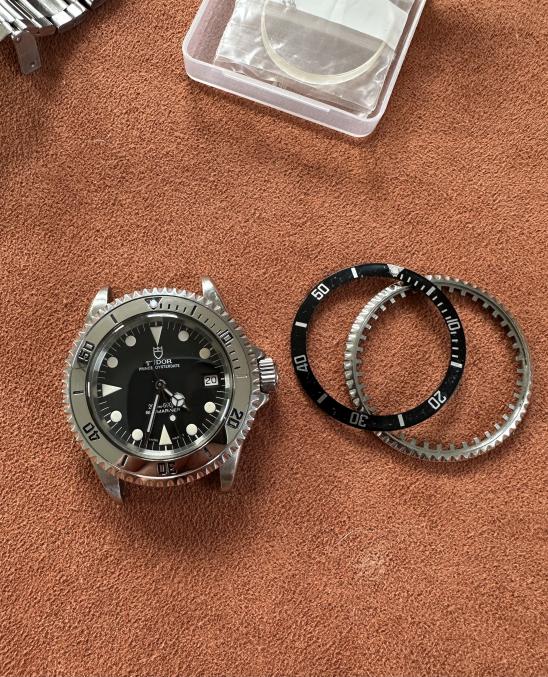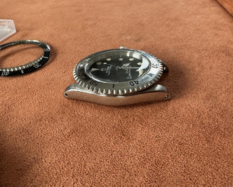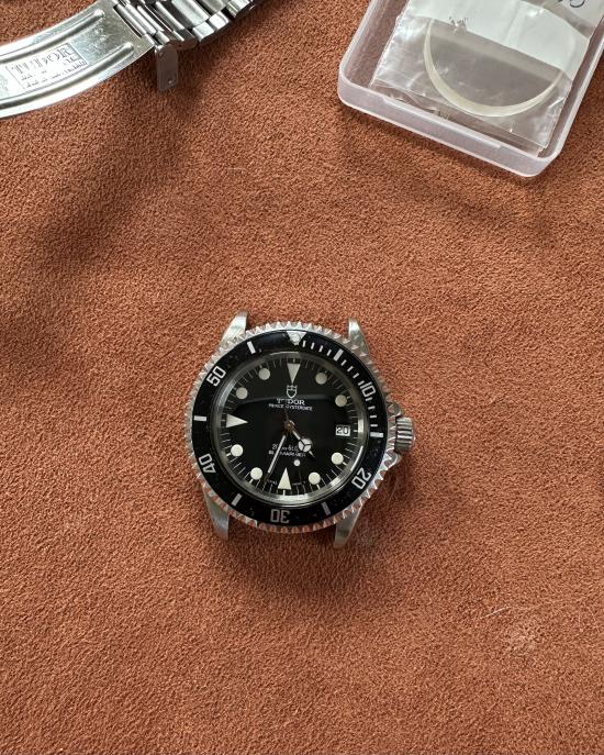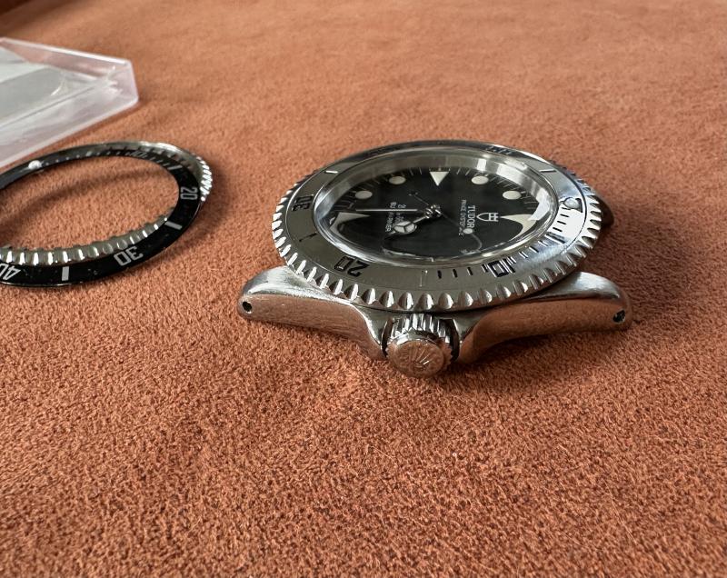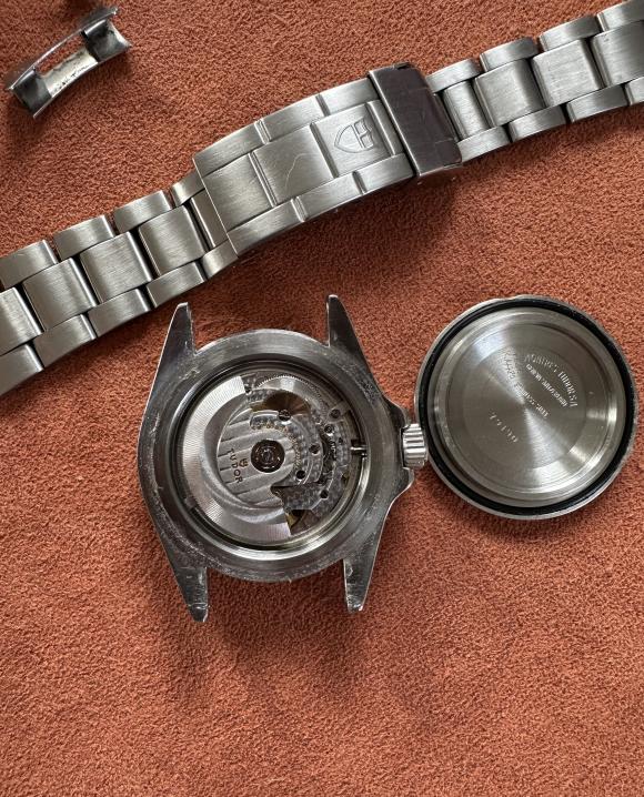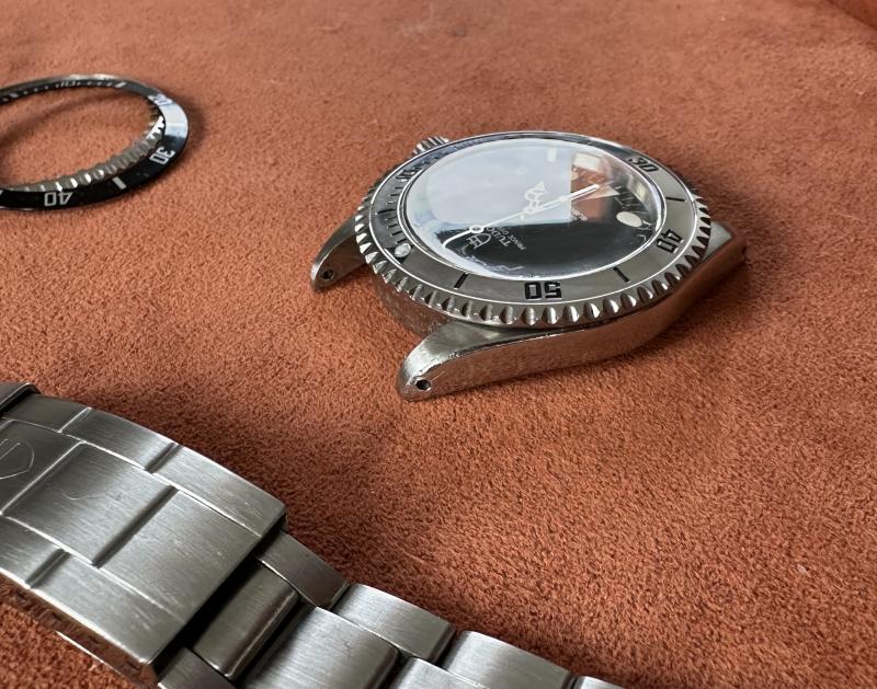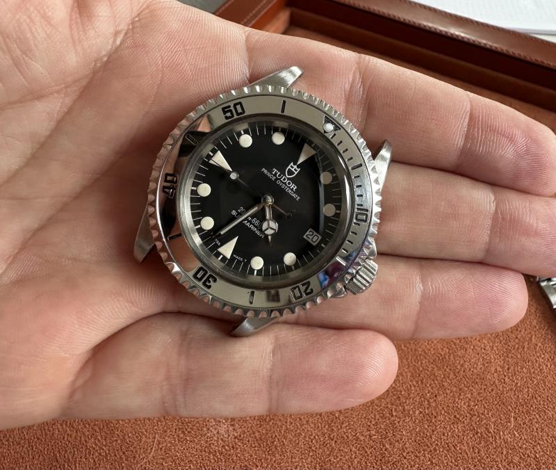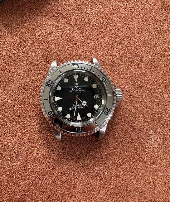 Tudor 79190 Seriennr B7…. aus ca 1996 mit der sehr seltenen Metall Lünette. Die Uhr wurde sehr gerne getragen und man sieht es ihr an. Einige Macken, auch am Deckel. Kann man machen lassen für kleines Geld heutzutage. Für mich gab es kein Anlass.