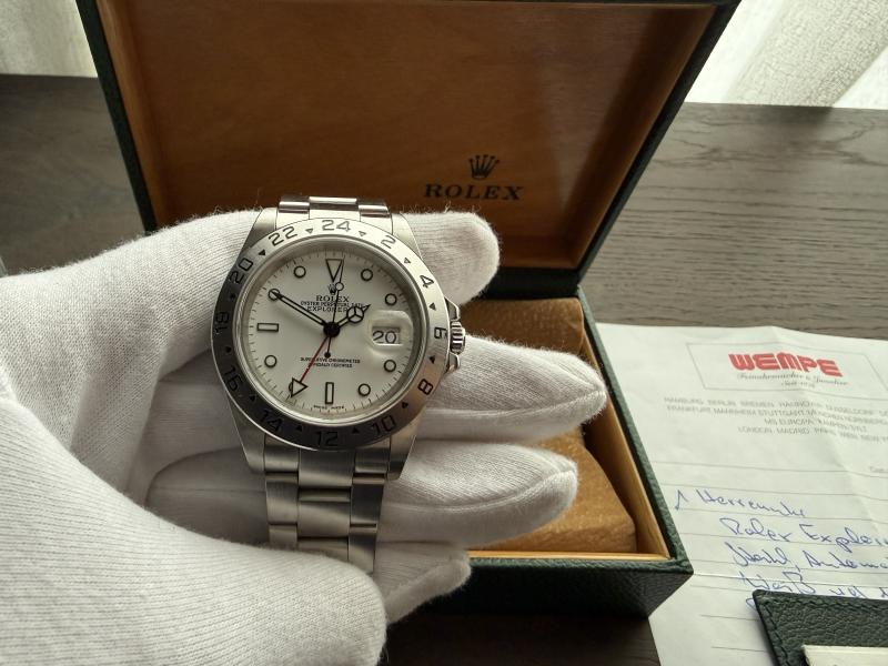 Aus meiner privaten Uhrensammlung verkaufe ich eine Rolex Explorer II mit der Referenz 16570 (P-Serie). Die Explorer wurde am 30.8.2001 bei Wempe in Bremen gekauft; somit LC100. Die Quittung vom Erstkauf liegt bei. Ich habe die Uhr im Dezember 2010 gekauft und seitdem selten getragen.