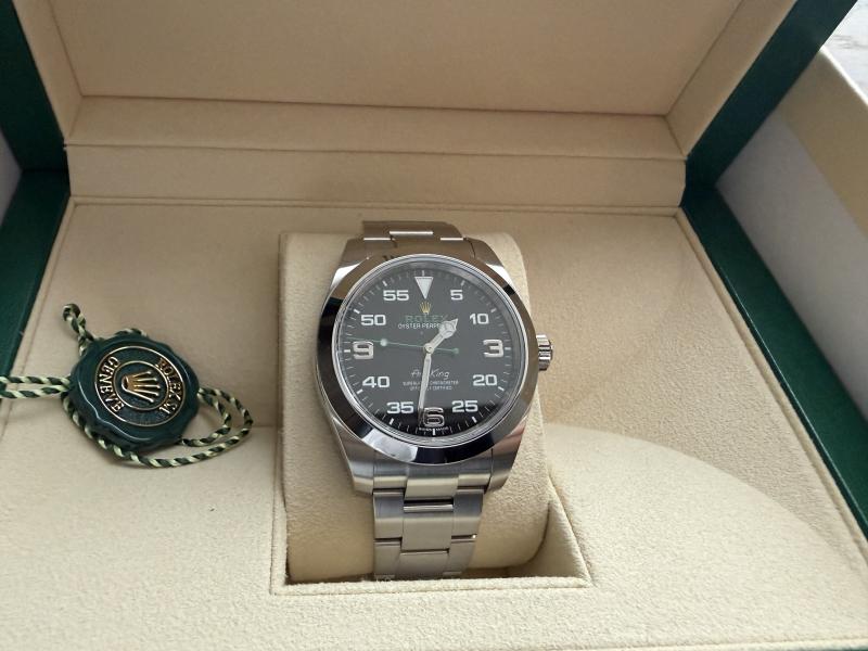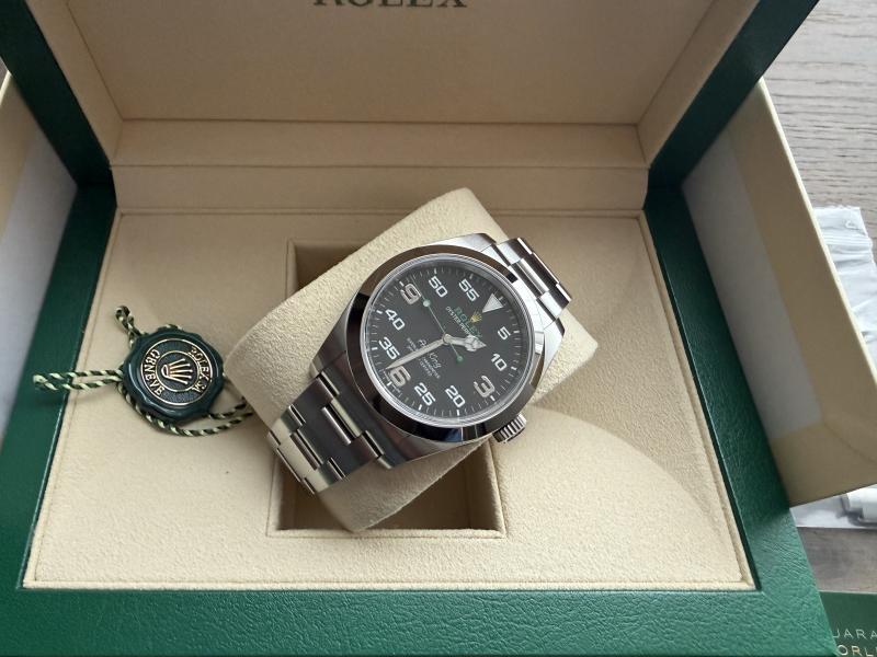 Aus meiner privaten Uhrensammlung verkaufe ich eine Rolex Air-King mit der Referenz 116900. Die Air-King wurde am 26.4.2019 bei Bucherer in Hamburg gekauft. Die Quittung vom Erstkauf liegt vor. Ich habe die Uhr im Mai 2019 von dem Erstbesitzer gekauft und nur sehr selten getragen. Es sind minimale Gebrauchsspuren vorhanden. Der Zustand kann als neuwertig bezeichnet werden.