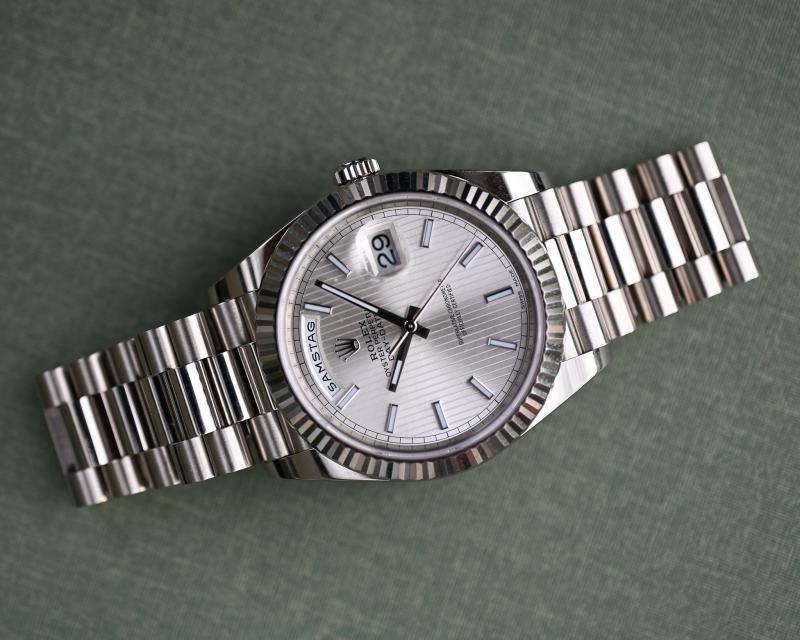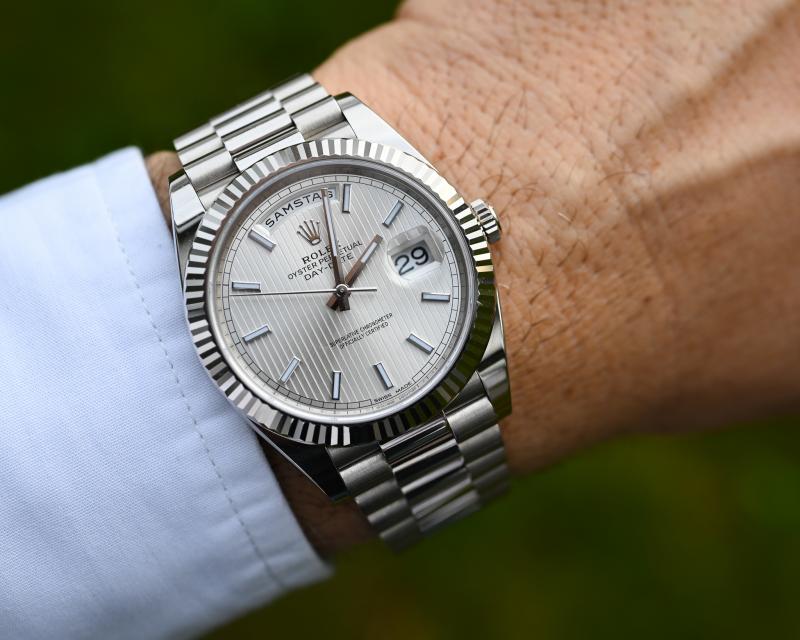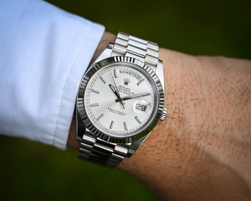 Ein besonderes Highlight dieser Day-Date ist das silberne Tapestry-Zifferblatt. Dieses seltene Blatt wirkt auf den ersten Blick dezent und zurückhaltend, offenbart jedoch bei näherer Betrachtung eine faszinierende Tiefenwirkung. Die vertikale Struktur verleiht dem Zifferblatt eine elegante Spannung und macht die Uhr zu einem subtilen, aber außergewöhnlich raffinierten Blickfang.