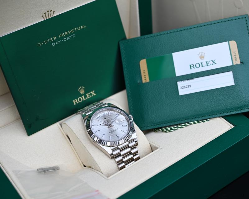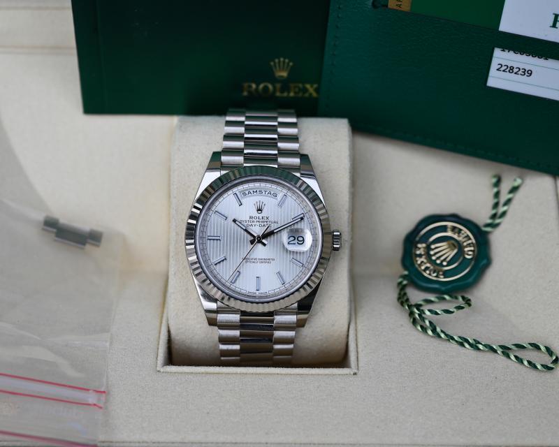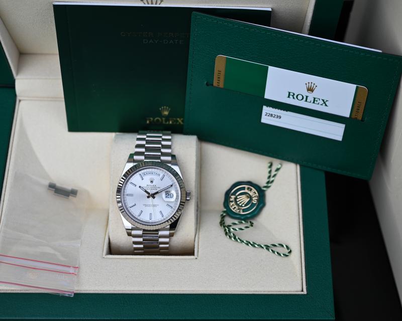 Zum Verkauf steht eine herausragend schöne Rolex Day-Date 40 (Ref. 228239) aus dem Jahr 2020, ausgeführt in edlem 18 Karat Weißgold.