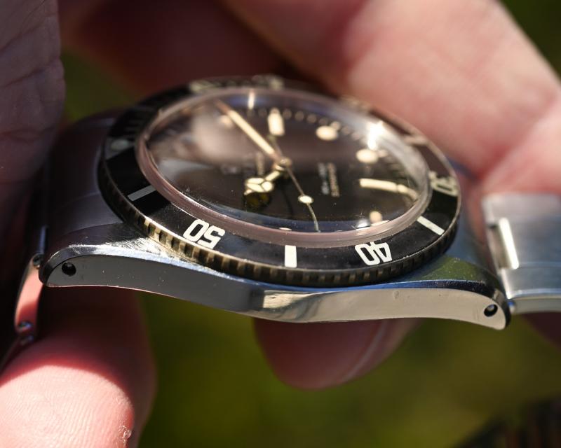 Das originale Zifferblatt begeistert mit 100 % erhaltenem Glanz, während die intakte Tritium-Leuchtmasse und die korrekten, zeitgenössischen Zeiger die Authentizität dieses Zeitmessers unterstreichen. Hervorzuheben ist ebenfalls das sehr schön gefadete „Kissing-4“-Lünetteninsert, das der Uhr eine unvergleichliche Vintage-Ästhetik verleiht.