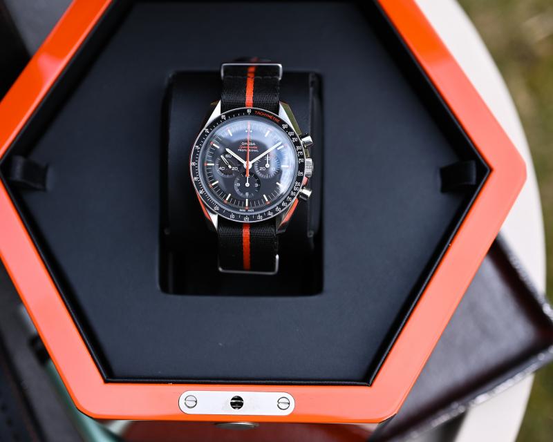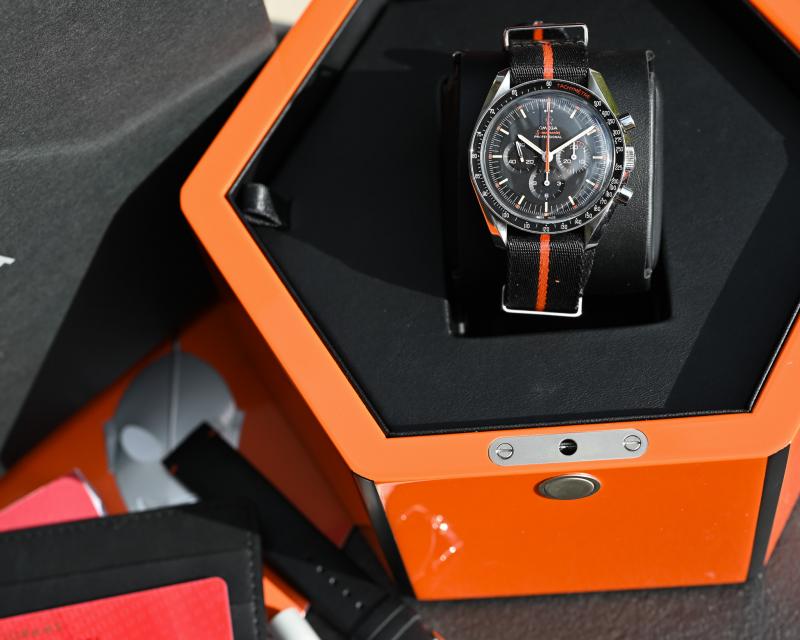 Ihr markantestes Merkmal ist der orangefarbene Chronographen-Sekundenzeiger, der als Hommage an die japanische Kultserie Ultraman gestaltet wurde. Weitere liebevolle Details – wie versteckte Anspielungen auf dem Zifferblatt und Gehäuseboden – machen diese Referenz zu einer der begehrtesten modernen Speedmaster-Sondermodelle.