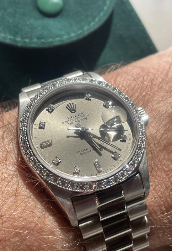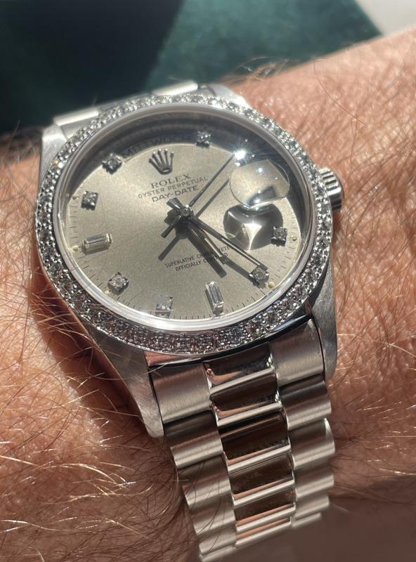 Vor garnicht allzu langer Zeit bei Michi/Vanessa gekauft. Es ist eine 18049, allerdings mit Aftermarket-Dia-Lünette (die trotzdem sehr schön ist) sowie einer Riffel-Lünette der 18039 mit Gebrauchsspuren. Bitte schaut Euch die -ungeschönten- Bilder an und bildet Euch ein Urteil. Uhren aus meinen Verkäufen sind in Natura immer schöner, als auf den Photos. Ich zitiere die damalige Anzeige von Michi "Das Case ist phantastisch, sehr fett mit wenig Tragespuren und das Blatt mit Brillis scheint je nach Lichteinfall von grau bis grünlich- wunderbar! ". Die Uhr wurde seitdem ca. 2 Wochen getragen.