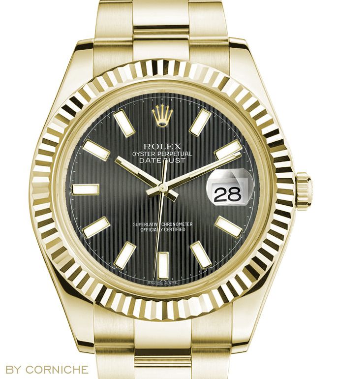 Dafür gibt es jetzt die Datejust II in Gold mit schwarzem Tapestry Blatt: