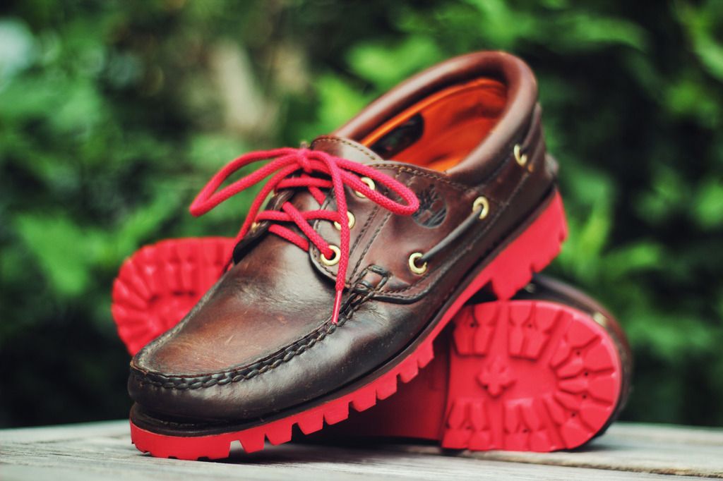 Also bin ich mit den Schuhen hin und habe meine Vorstellungen beschrieben. Erstes Versuchsobjekt waren die 3-Eye Classic Lug mit der Profilsohle. Hier sollte eine knall rote Profilsohle dran. Gesagt getan. Die alten Ledersenkel wurden nicht komplett ausgetauscht sondern umlaufend um den Schuh herum belassen, abgeschnitten und innenseitig verklebt. Neue rote Stoffsenkel wurden nur vorne in die Schnürleiste eingezogen. Das war die Idee des Schusters. Komplett rote Senkel wären dann vielleicht doch etwas zu viel geworden.