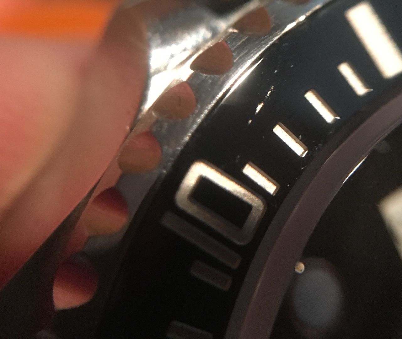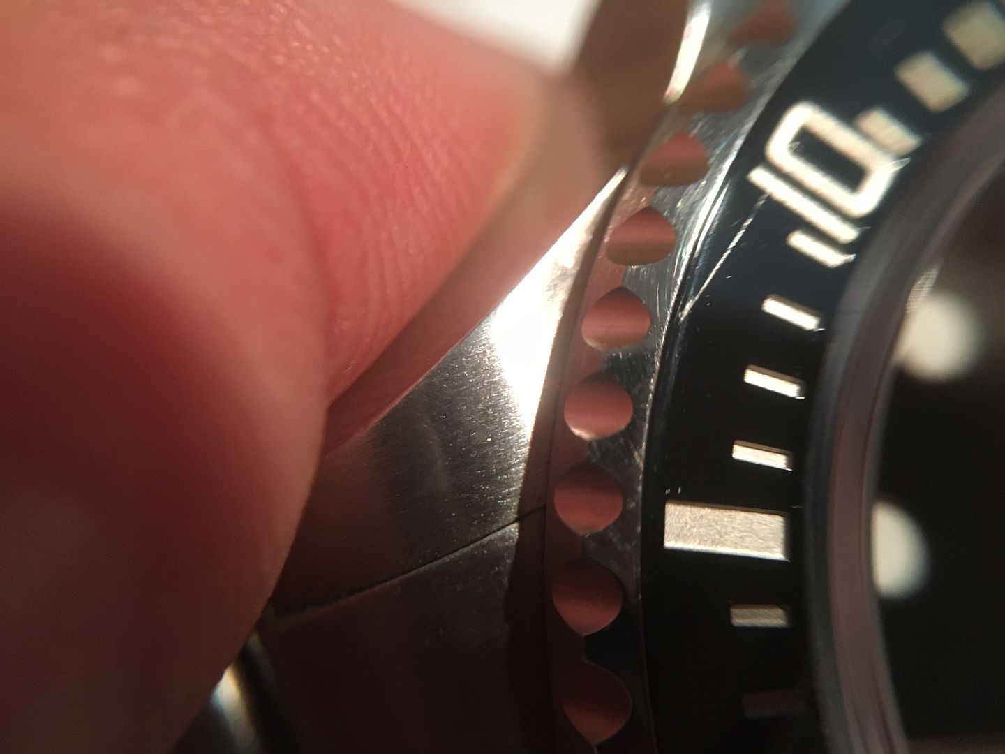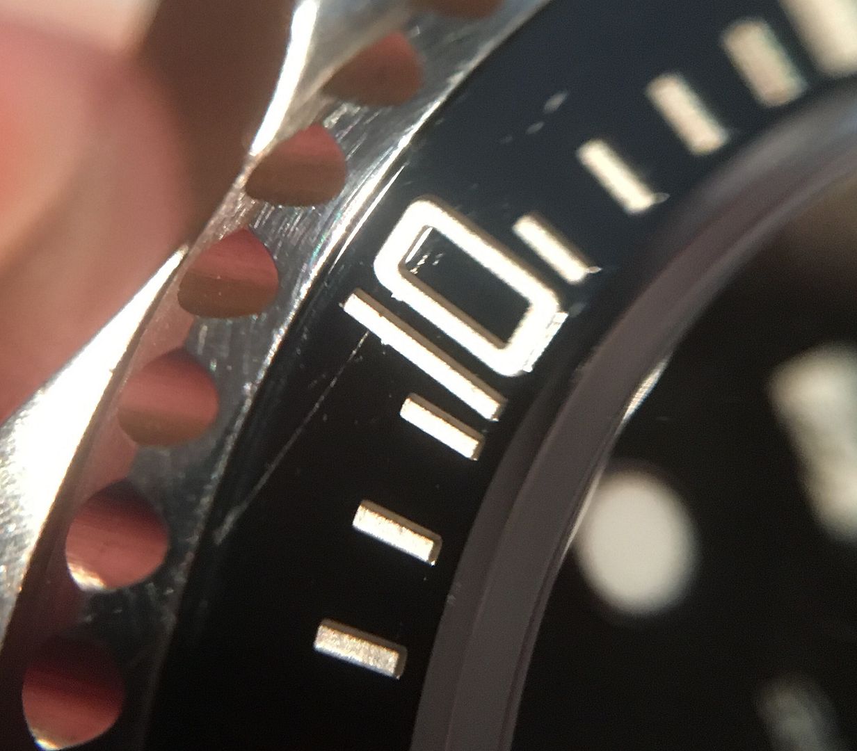 Udo da glaub ich irrst du dich mit dem Aluabrieb. Das auf dem Bild ist definitv entweder ein Kratzer oder ein Bruch. Was hier hell zu sehen ist ist nur das durch den Kratzer/Spalt anders reflektierte Licht. Für mich ist dort zu 100% Materialabtrag bzw. ein Spalt in der Lünette zu sehen.