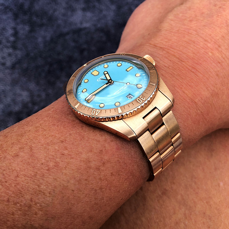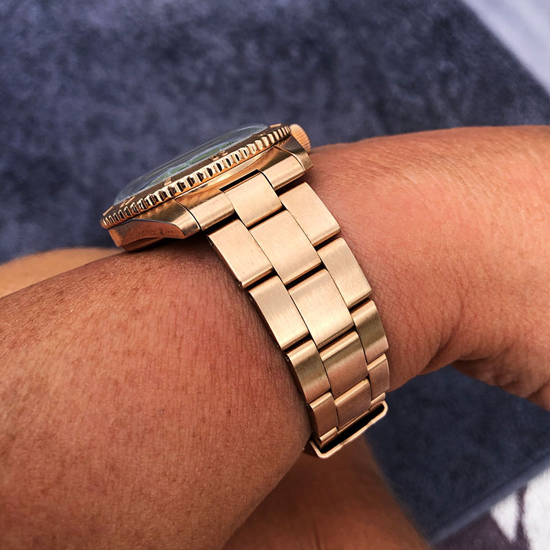 Das Gehäuse mit 2mm mehr wirkt mächtig, ist aber im Rahmen. Die Farbkombi ist für mich absolut stimmig, die schön große Dornschließe tut ihr Übriges. Einziger Kritikpunkt ist für mich das Lederband, welches ein klein wenig minderwertig erscheint, aber das ist ja korrigierbar.