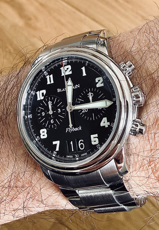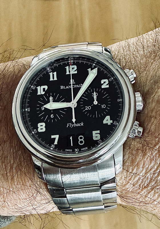 In meinem früheren Uhrenleben war der Blancpain Chrono die Krönung meiner damaligen Sammlung. Es war allerdings das kleine Modell aus der Villeret Serie mit nur 34mm Durchmesser am Lederband. Das Ding hat damals um die 10.000 Mark gekostet. Irre, für so ein winziges Stahlührchen.