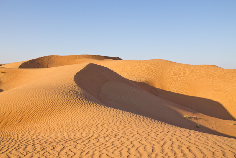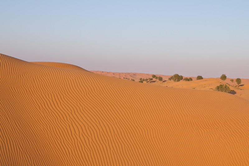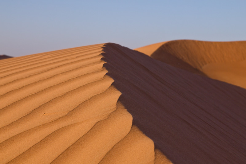 Der absolute Wahnsinn: Plötzlich stand ich mitten in der Wüste und konnte praktisch in jeder Richtung das perfekte Fotomotiv sehen. Besonders magisch waren die Spitzen der Sanddünen mit ihrer harten Hell-Dunkel Grenze. Eine leichte Brise sorgte für fliegenden Sand über die Kuppen, der sich fotografisch gar nicht so einfach auf den Chip bannen lassen wollte.