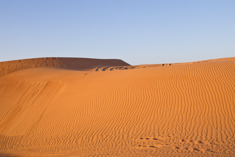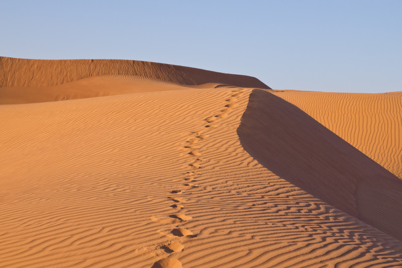 Nein, ich möchte mich an dieser Stelle nicht zu sehr über die Schwierigkeiten beim Knipsen der Bilder auslassen. Aber ein Grundproblem in der Wüste sollte man nicht außer Acht lassen: Wer die unberührte Wüste fotografieren will, darf sich vorher nicht selbst durchs Bild latschen. Einmal in den Boden gestampfte Fußspuren können nicht rückgängig gemacht werden. Das ganze führt zwangsläufig dazu, dass man es sich gut überlegt, ob man denn von einem Punkt genügend Fotos geschossen hat. Geht man ein paar Meter, ist das Motiv unwiederbringlich zerstört.