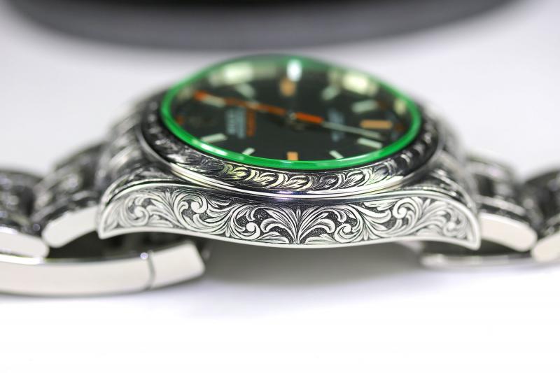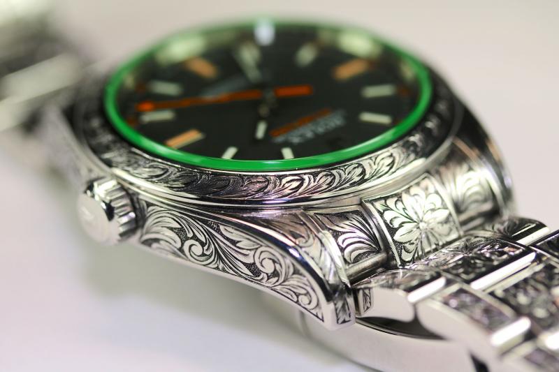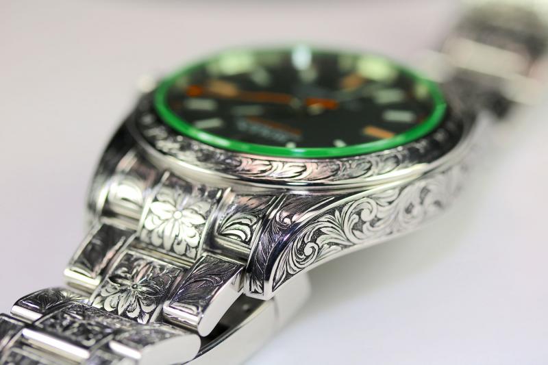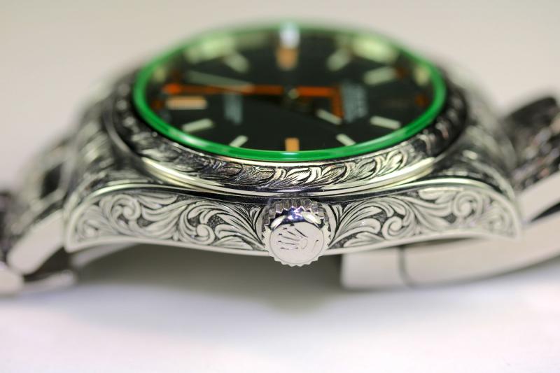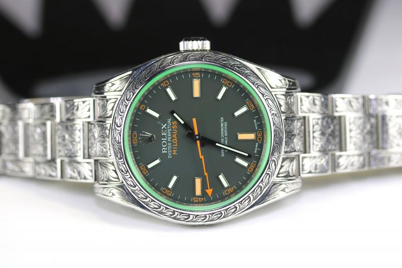 Verkaufe sensationell schöne Milgauss GV 116400, Serial V677132. Die Uhr wurde komplett im Stil der englischen Büchsenmacher graviert- auf den ersten Blick gewöhnungsbedürftig, auf den zweiten und dritten Blick einfach sensationell.