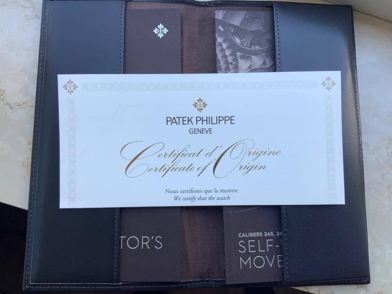 Die Uhr wird Inklusive dem gesamten Lieferumfang und den originalen Papieren verkauft. Neben dem schwarzen Armband wird noch ein weiteres originales Patek Armband in der Farbe Burgundy mitgeliefert. Das blaue Armband, welches auf dem Bild zu sehen ist, wird hingehen nicht mitverkauft.