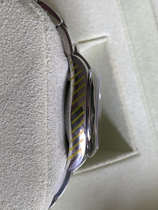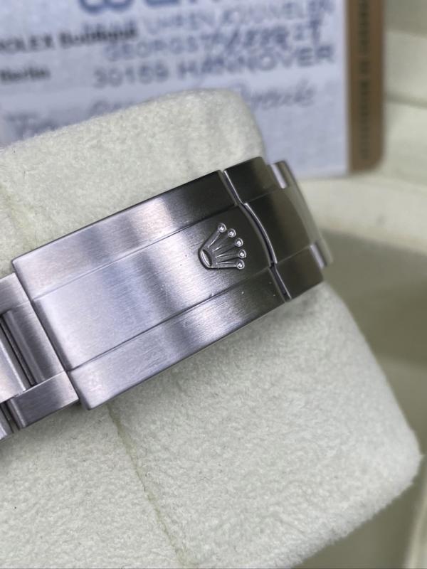 Die Uhr wurde 2011 bei Wempe in Hannover erstmals verkauft. im März 21 war sie über Lepple zur Revision für 700E samt Aufarbeitung und neuem Glas. Seitdem ungetragen und noch verklebt. Das Band ist nicht ausgeleiert, insgesamt ein sehr schöner Zustand.