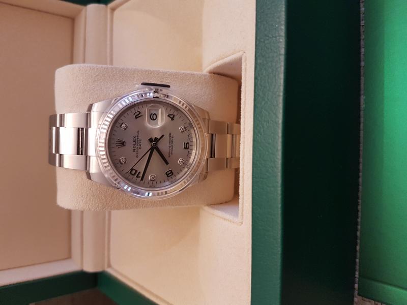 Verkaufe Rolex Date 34 mm Ref. 115 234 / weiß mit 5 Diamanten