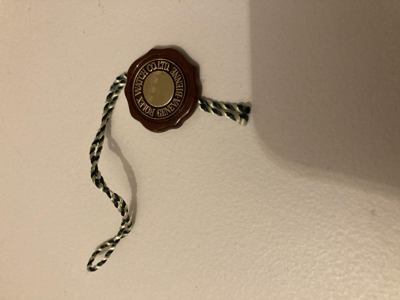 weisslichgelb-grüne Kordel, rotes Siegel mit kleinen Kronen und Rolex Schriftzug im Hologramm