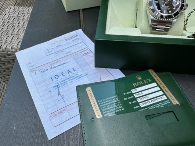 Die Uhr ist aus 2010 (V-Serie) und wurde beim offiziellen Konzessionär auf Fuerteventura gekauft. Ich bin erster Besitzer, die Erstkaufrechnung ist vorhanden - und natürlich Full Set. Die Uhr wurde von mir immer wie ein rohes Ei behandelt und ist komplett unpoliert, also im Originalzustand. Ein paar unvermeidliche Micro-Swirls gibt es natürlich.
