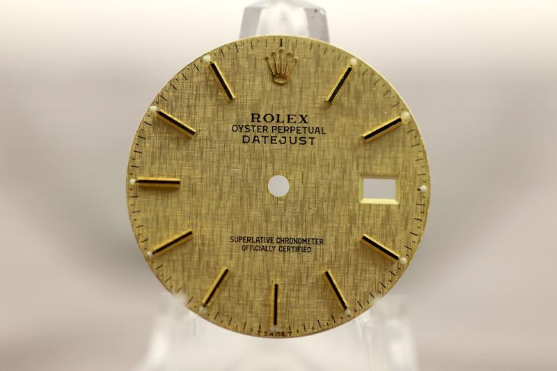 Wonderful gold linen dial with black lined index for Rolex Datejust 16013 and other refs. Gold/ 2tone versions. Lume is tritium.
