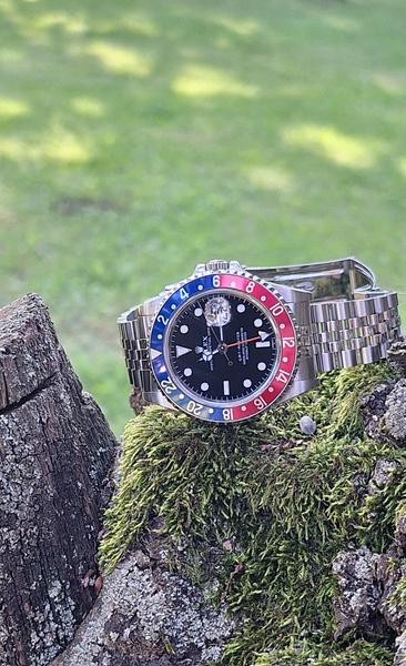 Extrem lässige GMT mit schwarzer Lünetteneinlage und Jubileeband.