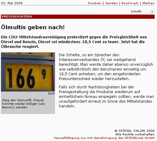 Meistens zahlen doch eh die Firmen den Sprit für die Dienstwagen. Und ich fahr meistens Fahrrad, brauch ich auch kaum Sprit. Ist zudem gesund. Ok, ich gebe zu, ich wohne auch quasi direkt neben meiner Arbeitsstelle...