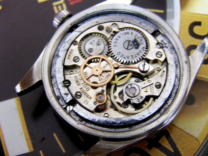 Gehäuse schon relativ runterpoliet...Dünne Bandhörnchen...Werk ist schlecht erhalten was man so am ersten Blick erkennen kann....Blatt wird es so nie gegeben haben..Zeiger neu...Band neu oder Fake (falsch)