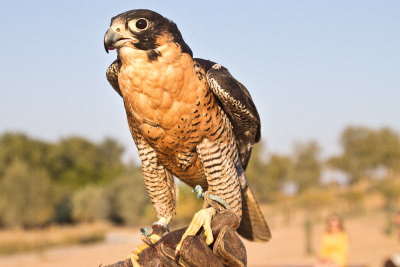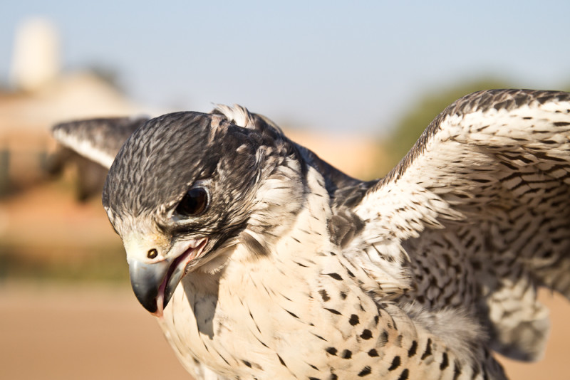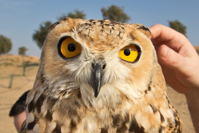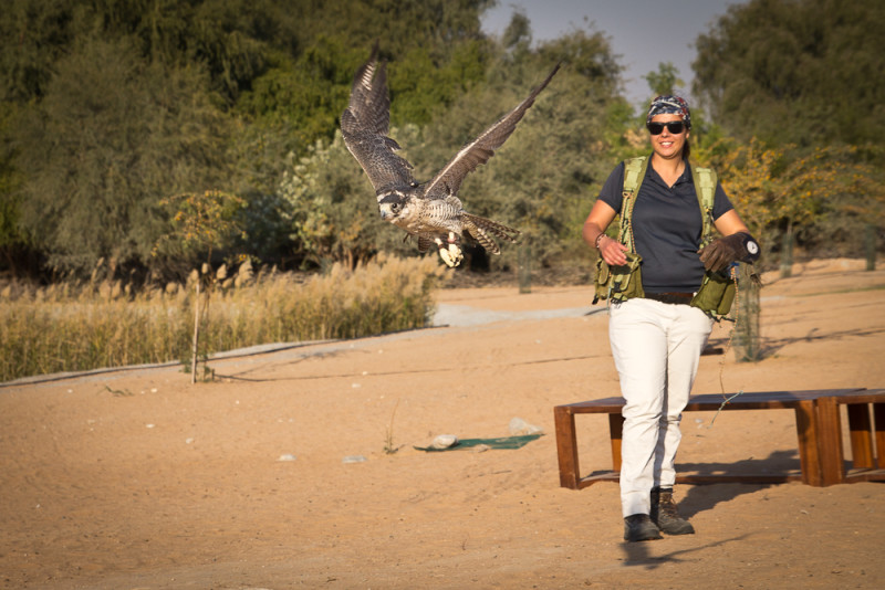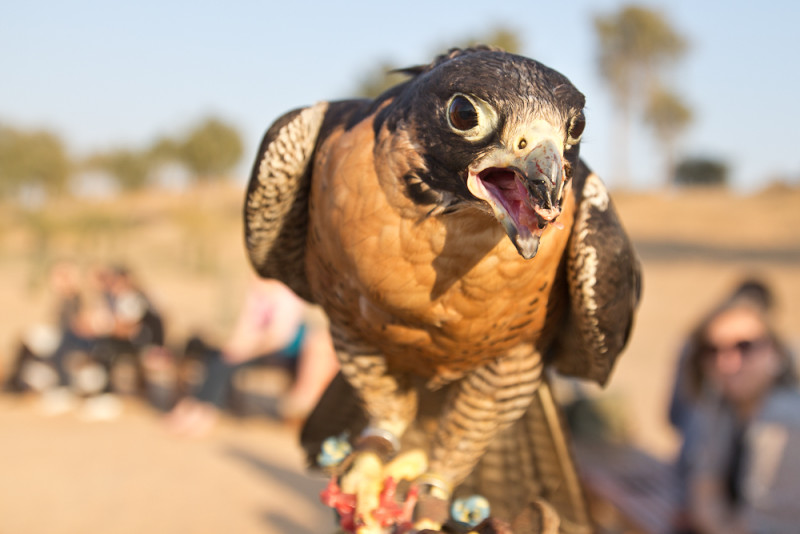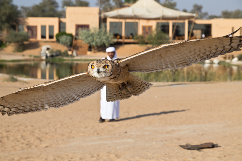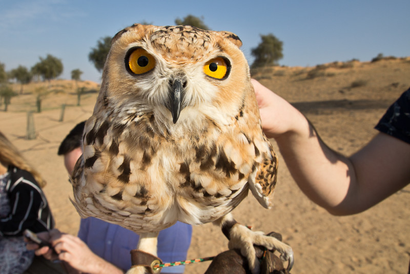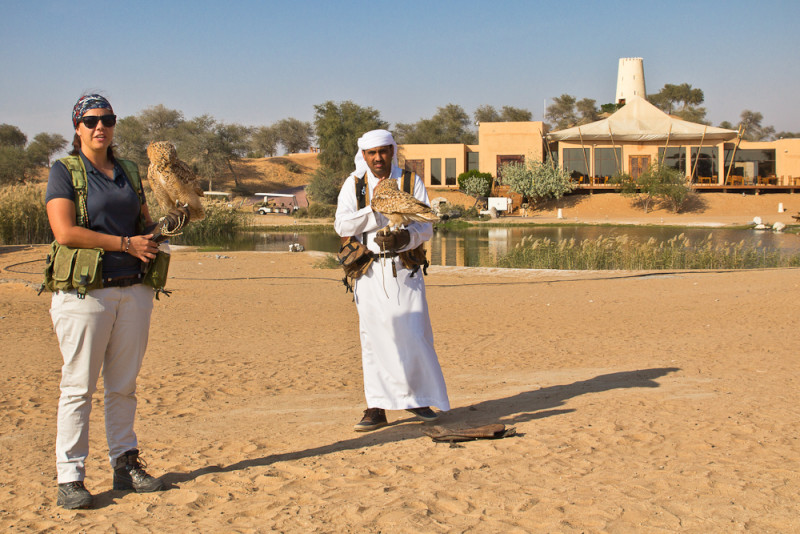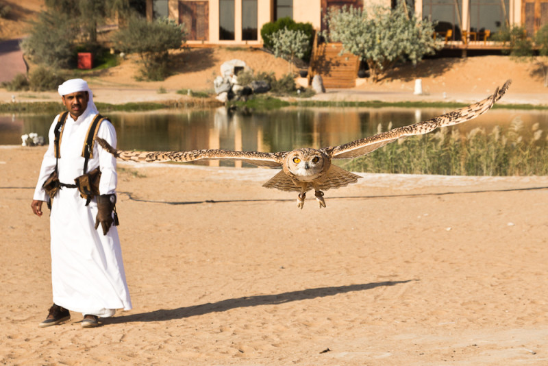 Gemessen an den Eulen fand ich die nachfolgende Falkenshow fast etwas uninteressanter. Natürlich gelten Falken in den Emiraten als die Krönung der Vogelarten und erzielen auf Auktionen unglaubliche Preise. Auch gibt es ganze Krankenhäuser für Falken.