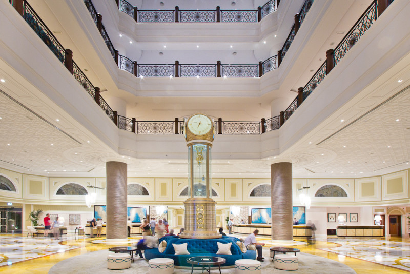 Nach den bisherigen fotografischen Eindrücken dürfte es euch nicht verwundern, dass das Gebäude des Waldorf Astoria ursprünglich als Palast erbaut wurde. Dementsprechend pompös ist auch die Lobby, in der ein goldener Uhrenturm aufgebaut ist, der im unteren Teil gleich mehrere Zeitzonen darstellen kann.